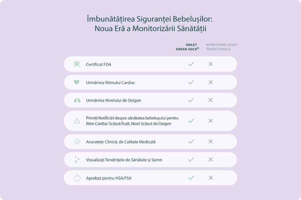 Owlet Dream Sock este un dispozitiv certificat medical care îți permite să monitorizezi ritmul cardiac, nivelul de oxigen din sânge și tiparele de somn ale copilului tău – din prima noapte acasă până în prima lui zi de școală. Toate datele sunt afișate în timp real, direct pe telefon, printr-o aplicație gratuită. Dacă ceva nu este în regulă cu cel mic și parametrii monitorizați ies din intervalele de siguranță, vei primi imediat o alertă care te va anunța că bebelușul are nevoie de ajutor.