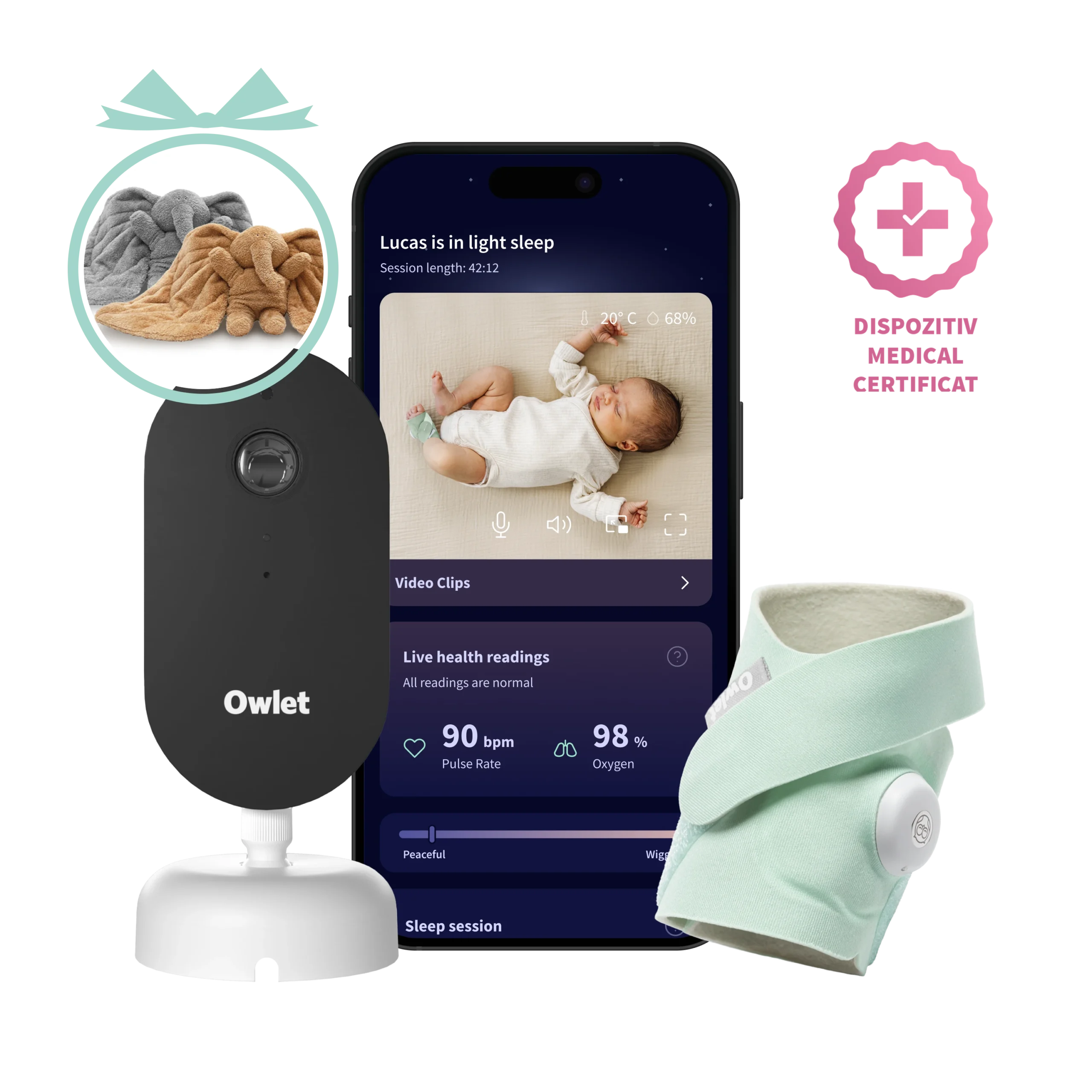 Owlet Dream Duo™ (a 3-a generație) este cel mai complet sistem de monitorizare a bebelușului de pe piață – combinând șoseta certificată medical Dream Sock®, camera inteligentă HD Dream Sight™ și aplicația Owlet Dream App într-o soluție unică și conectată