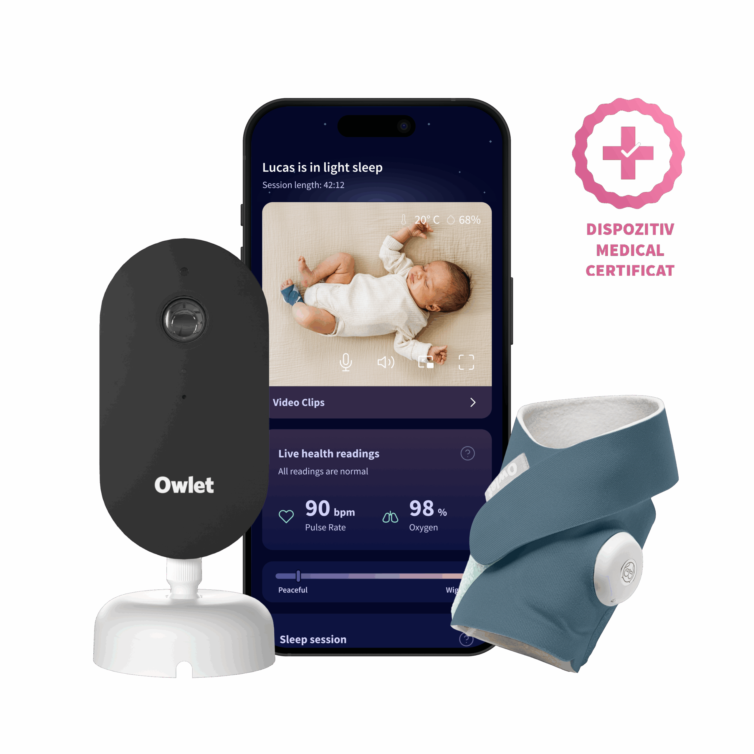 Owlet Dream Duo™ (a 3-a generație) este cel mai complet sistem de monitorizare a bebelușului de pe piață – combinând șoseta certificată medical Dream Sock®, camera inteligentă HD Dream Sight™ și aplicația Owlet Dream App într-o soluție unică și conectată
